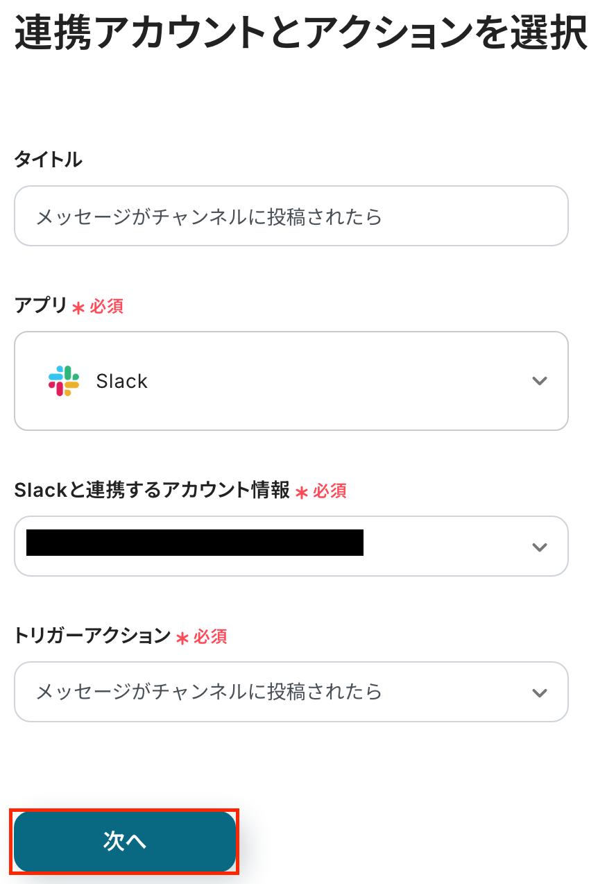 - 「トリガーアクション」:「メッセージがチャンネルに投稿されたら」を選択