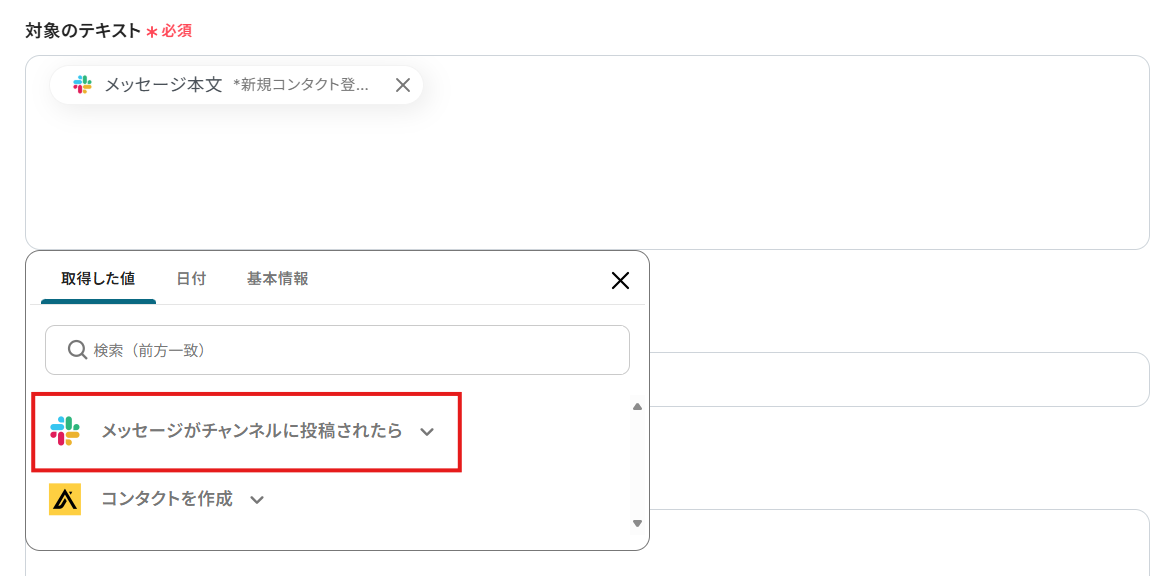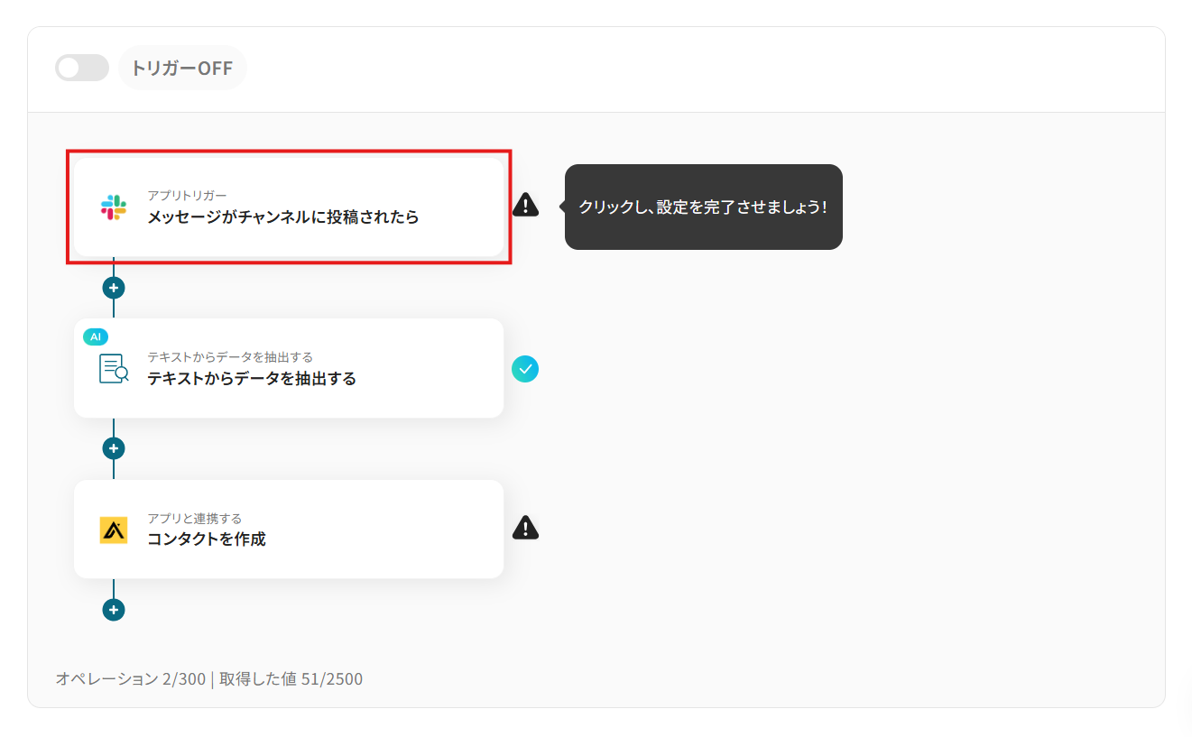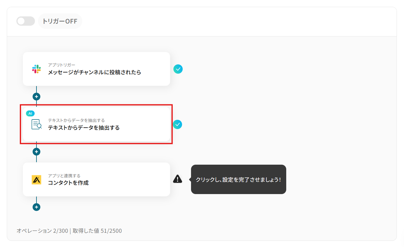 - Slackのトリガーと各アクション(データ抽出・コンタクト作成)の設定