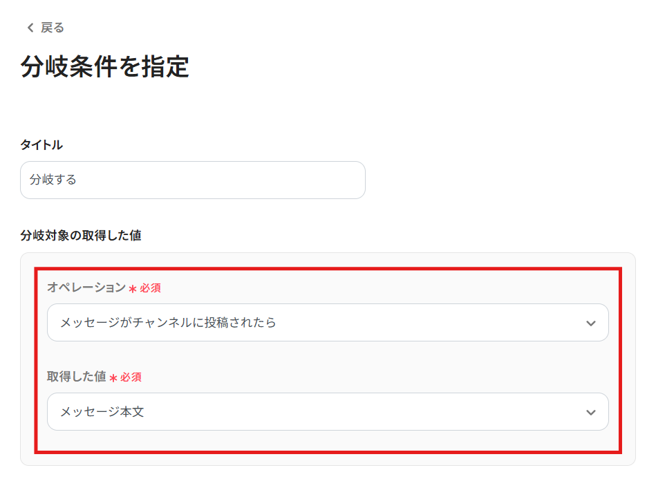 分岐条件の左枠には、「分岐対象の取得した値」の情報が自動反映されます。