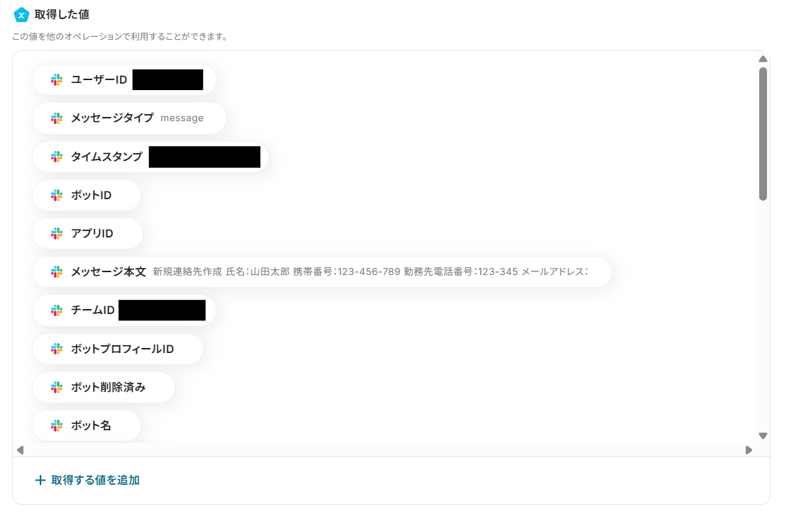 テストが成功すると、取得した値の横にSlackに送信したメッセージの詳細情報が表示されます。