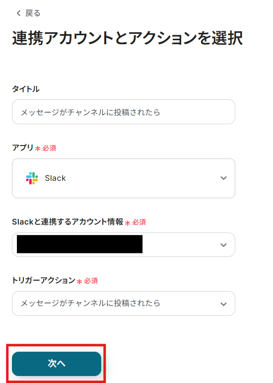 アカウント情報の項目にはステップ1でマイアプリ連携したSlackのアカウント情報が自動で表示されます。
