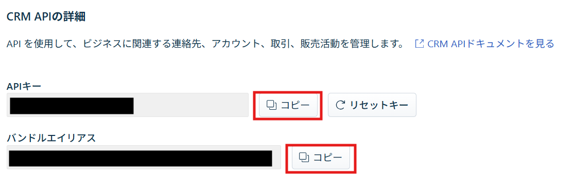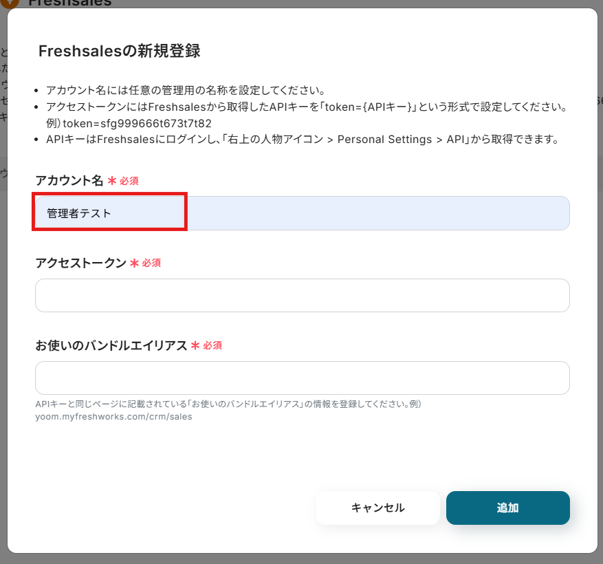 「アクセストークン」「お使いのバンドルエイリアス」は、Freshsalesから取得します。