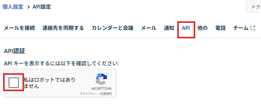 「API」タブをクリックし、API認証を行います。