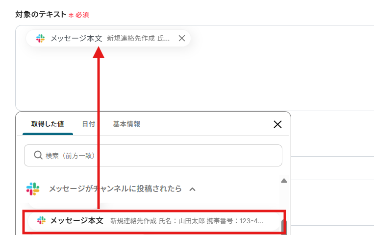 Slackに投稿されたメッセージの中から、特定のキーワードを含むメッセージのみを対象に、Freshsalesで連絡先を作成するアクションを設定します。