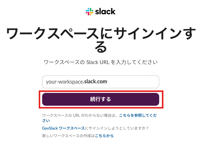 Slackを選択すると、下記の画面が表示されるので、ご利用のワークスペースURLを入力し、「続行する」をクリックしてください。
