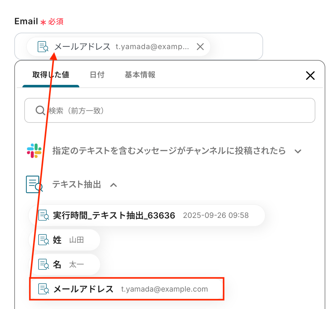 こちらも同じく入力欄をクリックすると取得した値が表示されるので、選択して入力してください。
