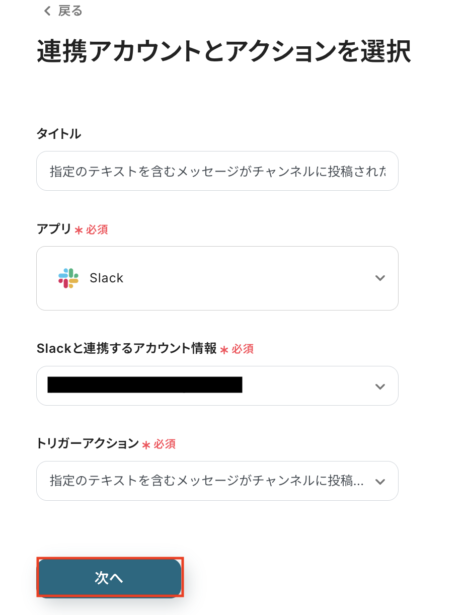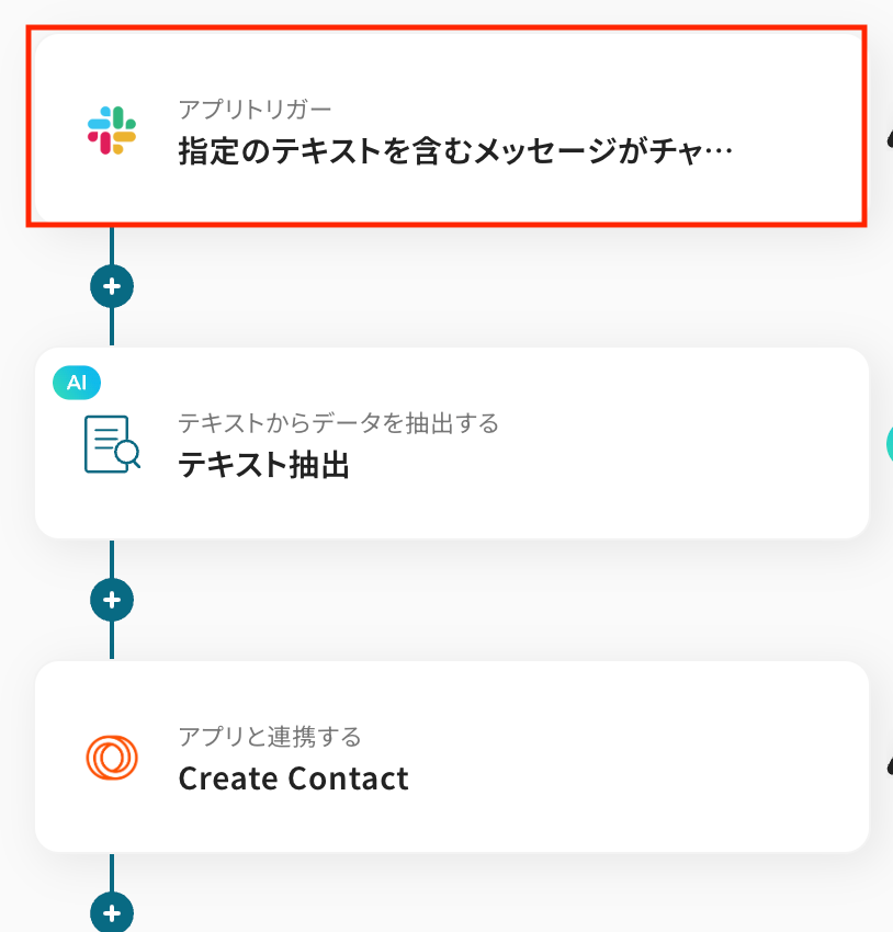 指定のテキストを含むメッセージがチャンネルに投稿されたタイミングで、自動処理を開始するための設定を行います。