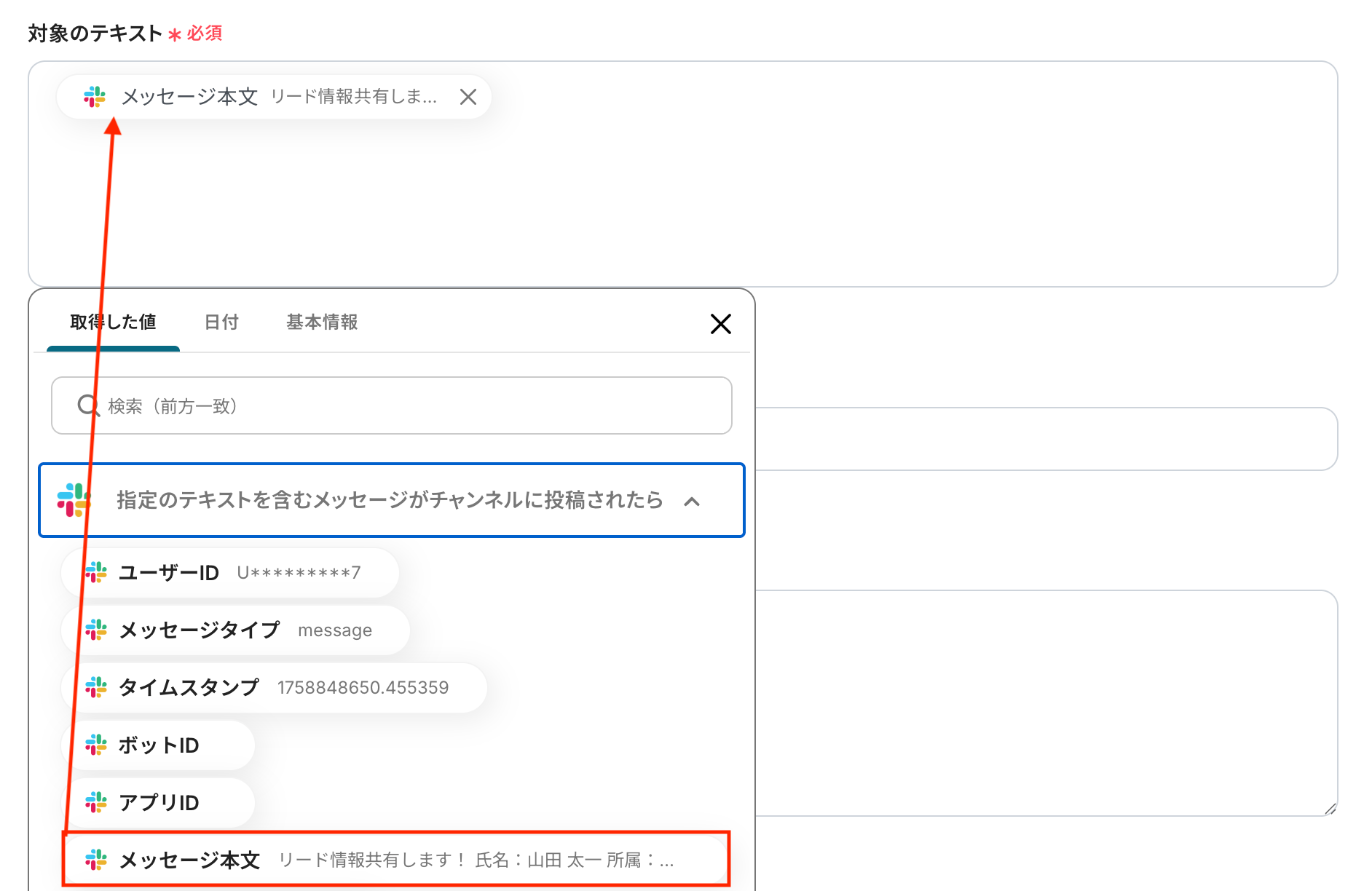 入力欄をクリックすると、前のステップでSlackから取得した値が表示されるので選択して入力しましょう。