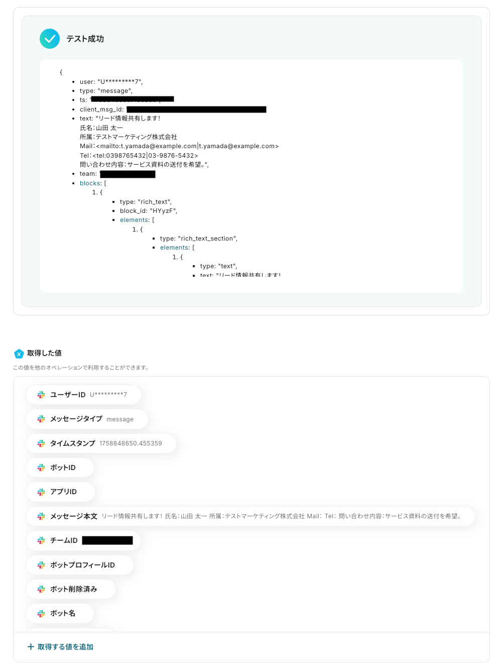 なお、テキストを直接入力した部分は固定値とされるため、取得した値を活用せず設定を行うと毎回同じデータがLoopsに作成されてしまうので注意が必要です。