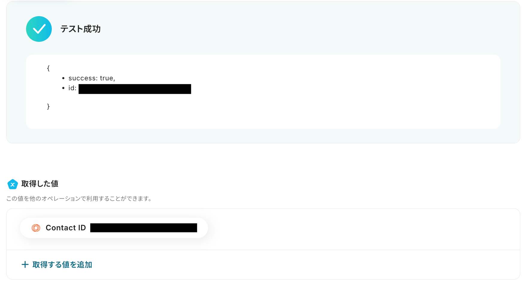 テストが成功すると、以下の通り作成されたコンタクトの情報が表示されます。