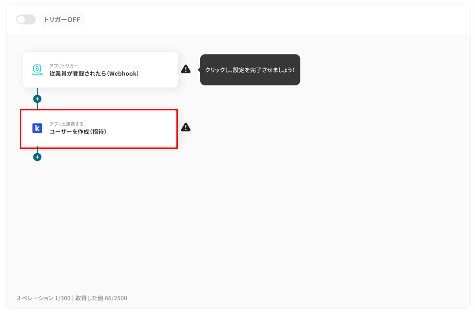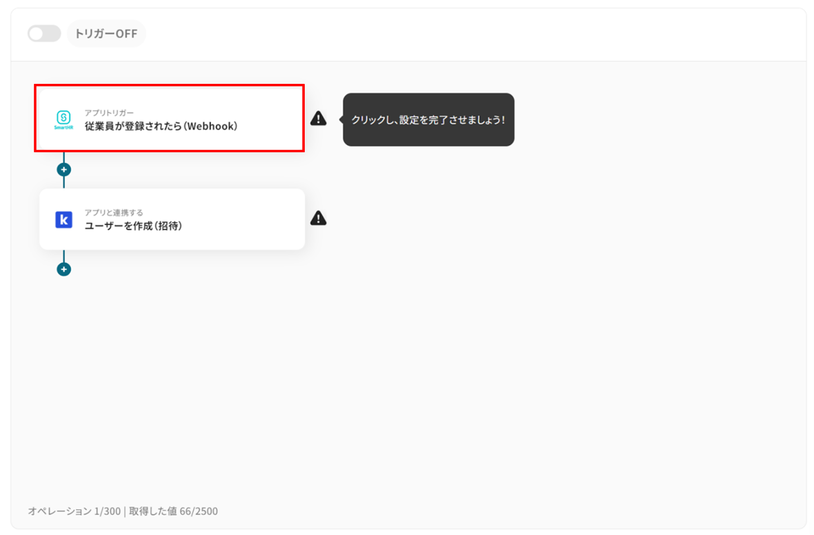 (1)アプリトリガーの「従業員が登録されたら(Webhook起動)」をクリックします。