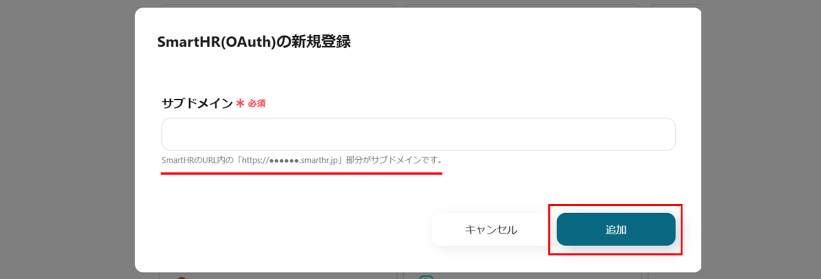 (2)「SmartHR(OAuth)の新規登録」画面より、赤線を確認の上、サブドメインを入力し、「追加」をクリックします。