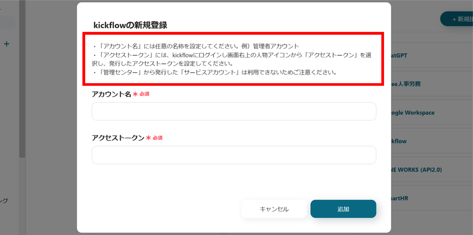 「kickflowの新規登録」画面から、赤枠を確認の上、アカウント名、アクセストークンを入力し、「追加」をクリックします。