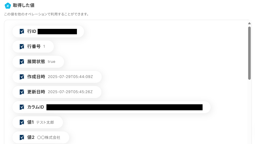 入力が完了したら、「テスト」を実行してみてください。テストが成功すると、以下のような結果が表示されます。Smartsheetのシート情報が正しくアウトプットとして反映されていれば問題ありません! 最後に、「保存」をクリックして、次のステップに進みましょう。