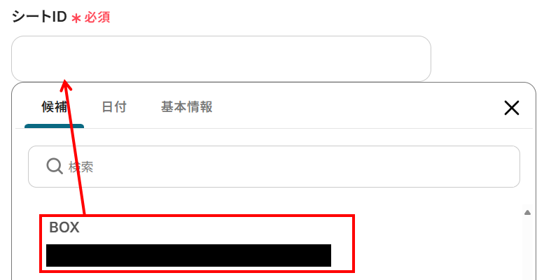 シートID:入力欄をクリックすると下記のように候補が表示されます。先ほど作成したシートを選択してください。