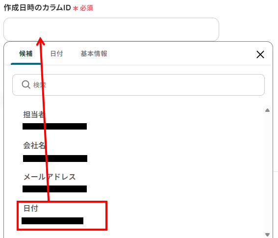 作成日時のカラムID:こちらも入力欄をクリックして、作成日時を選択しましょう。