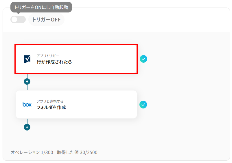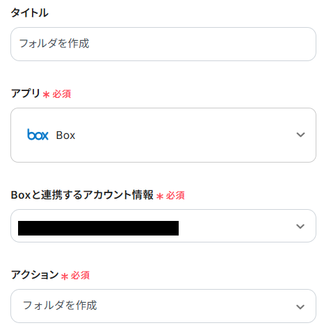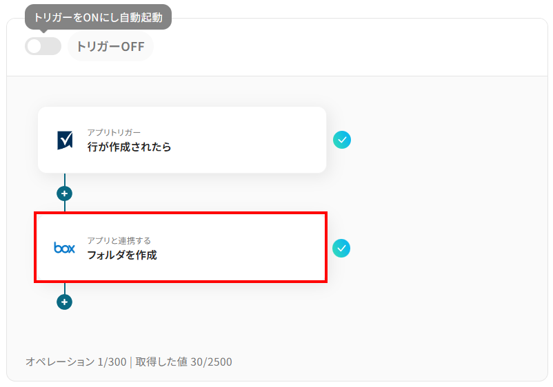 続いて、Smartsheetから取得したデータを用いて、Boxにフォルダを作成する設定をしましょう。下記赤枠をクリックしてください。