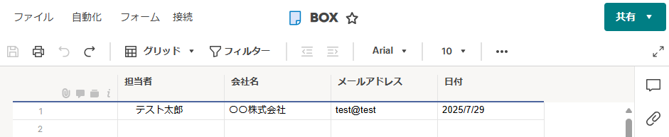 画面が切り替わったら、API接続設定のページになります。 こちらの設定の前に、トリガーとなるSmartsheetの準備をしましょう。なお、この後のテスト操作ために、カラムに日付を作成し、テスト用に行を1つ追加してください。(内容はテスト株式会社などの架空の情報でOKです) 今回は、下記のようなシートを準備しました。