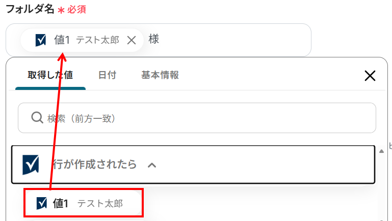 API接続設定画面になったら、フォルダ名と作成場所を設定しましょう。 フォルダ名の入力欄をクリックすると、下記のようにアウトプットが表示されます。このアウトプットを活用してファイル名を設定することも出来るので、運用内容に合わせてカスタマイズしてください。