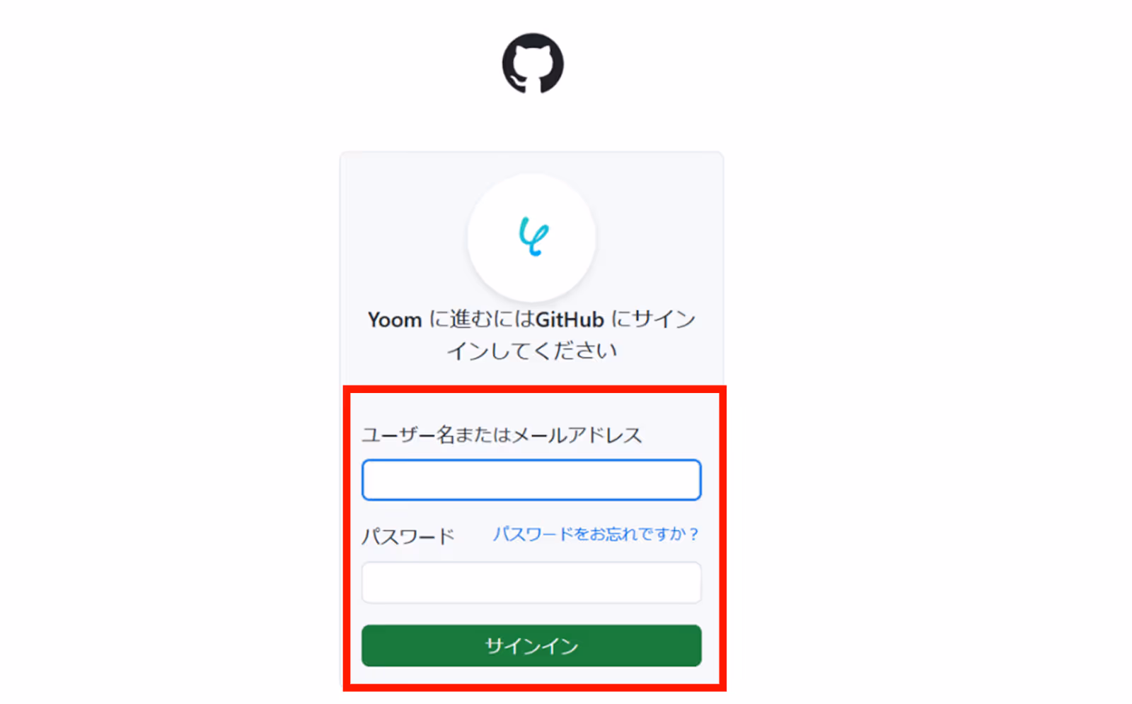 Yoomと連携するGitHubアカウントの「ユーザー名(またはメールアドレス)」と「パスワード」を入力し、「サインイン」をクリックしてください。