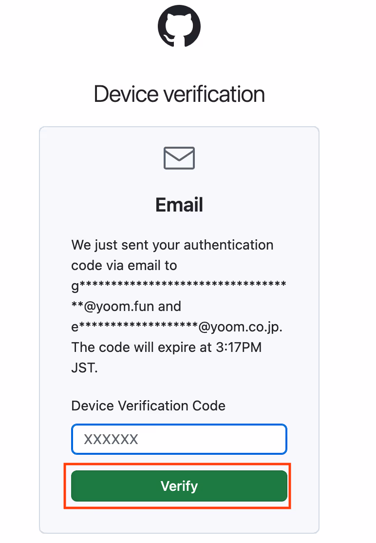 GitHubアカウントに登録しているメールアドレス宛に認証コードが届くので、コードを確認して入力しましょう。