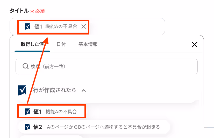 アウトプットとは、トリガーやオペレーション設定時に、「テスト」を実行して取得した値のことを指します。