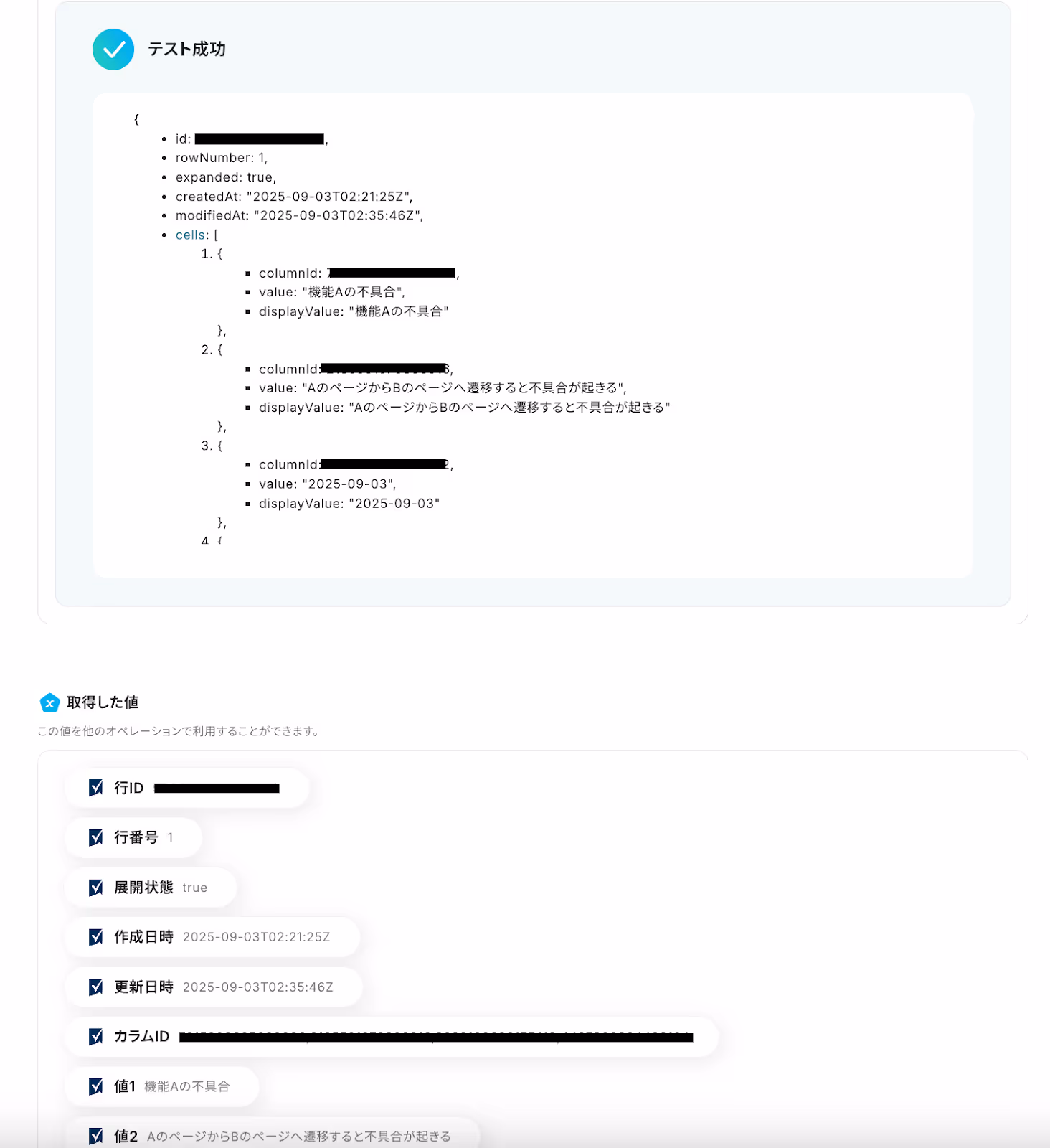テストが成功すると、先ほど作成した行の情報が「取得した値」にアウトプットとして抽出されるので、内容を確認しましょう。