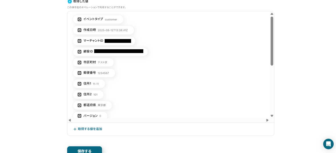 Squareに作成した顧客情報が取得した値(アウトプット)に表示されたのを確認し、「保存する」ボタンを押してください。