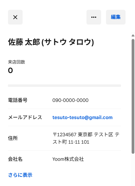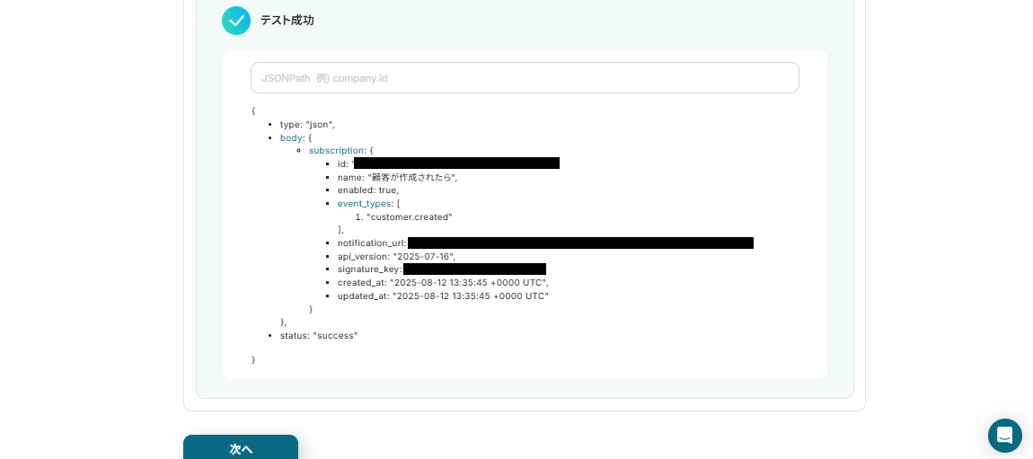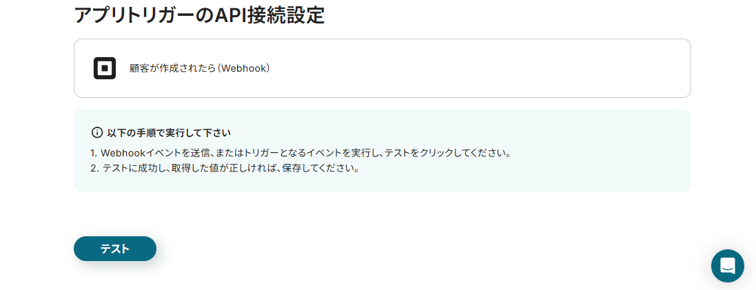テスト用の顧客を作成できたら、再びYoomの画面に戻って「テスト」ボタンをクリックしましょう。