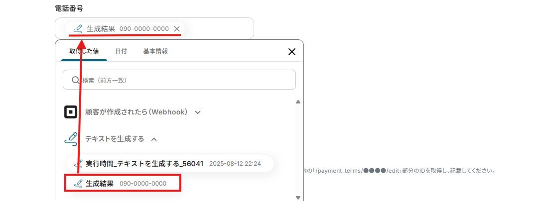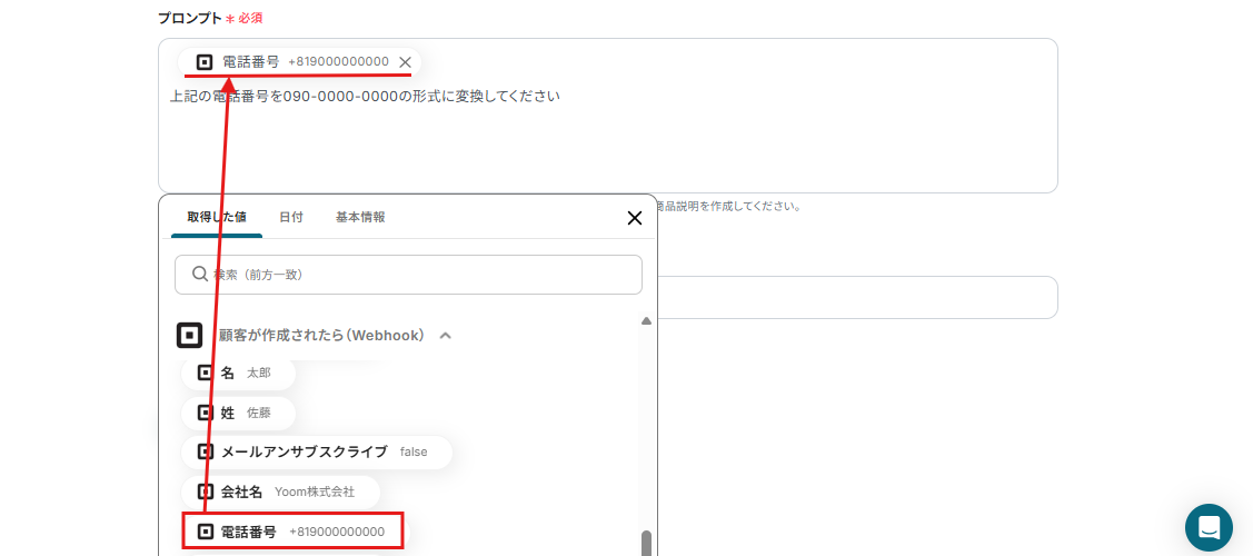 プロンプトには、以下のようにSquareから取得した値から「電話番号」を選択し、boardに登録できる形式に変換する指示も入力しましょう。