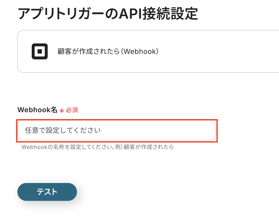 Webhook名には、任意の値を入力して、テストをクリックします。