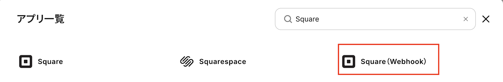 アプリ一覧でSquare(Webhook)を選択します。(ここではトリガーでWebhookを使用するため)