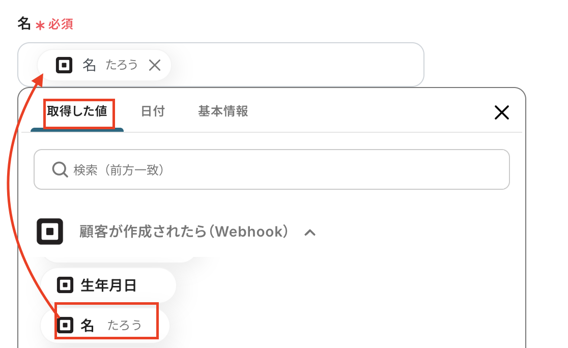 設定方法は、添付画像のようにSquareの取得した値から選択してください。(ここでは名を例に設定しています。)