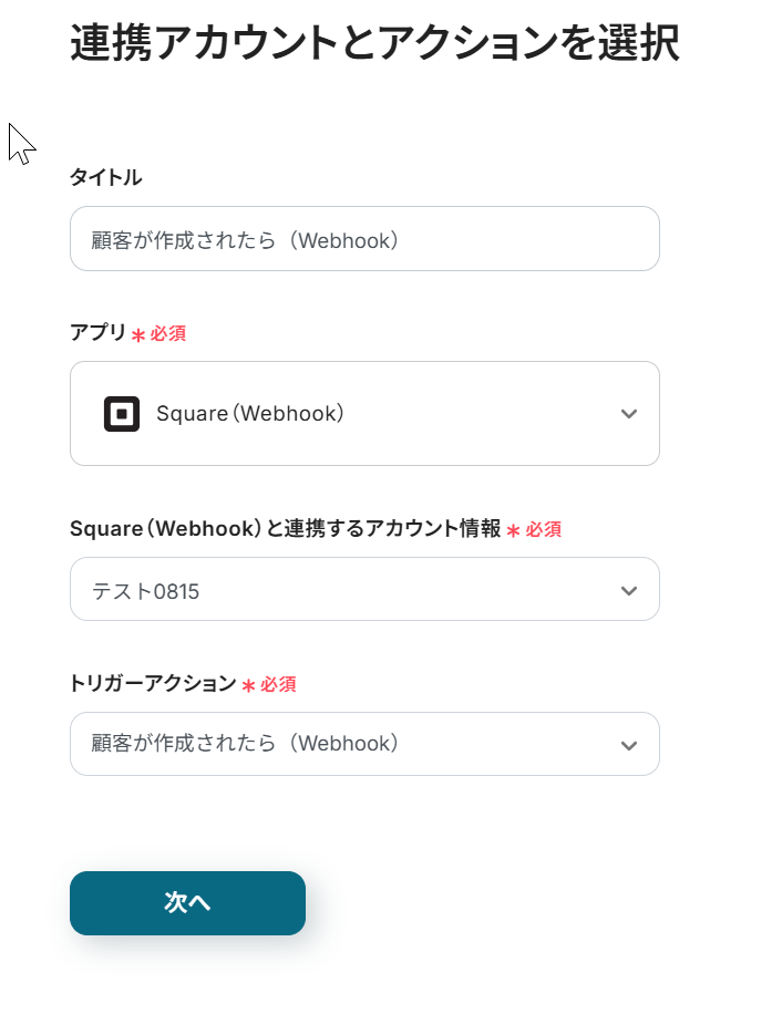 今回はWebhookを使用するため「Square(Webhook)」をクリックしてください。