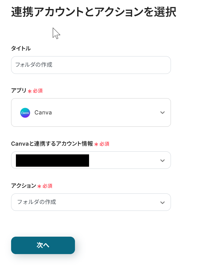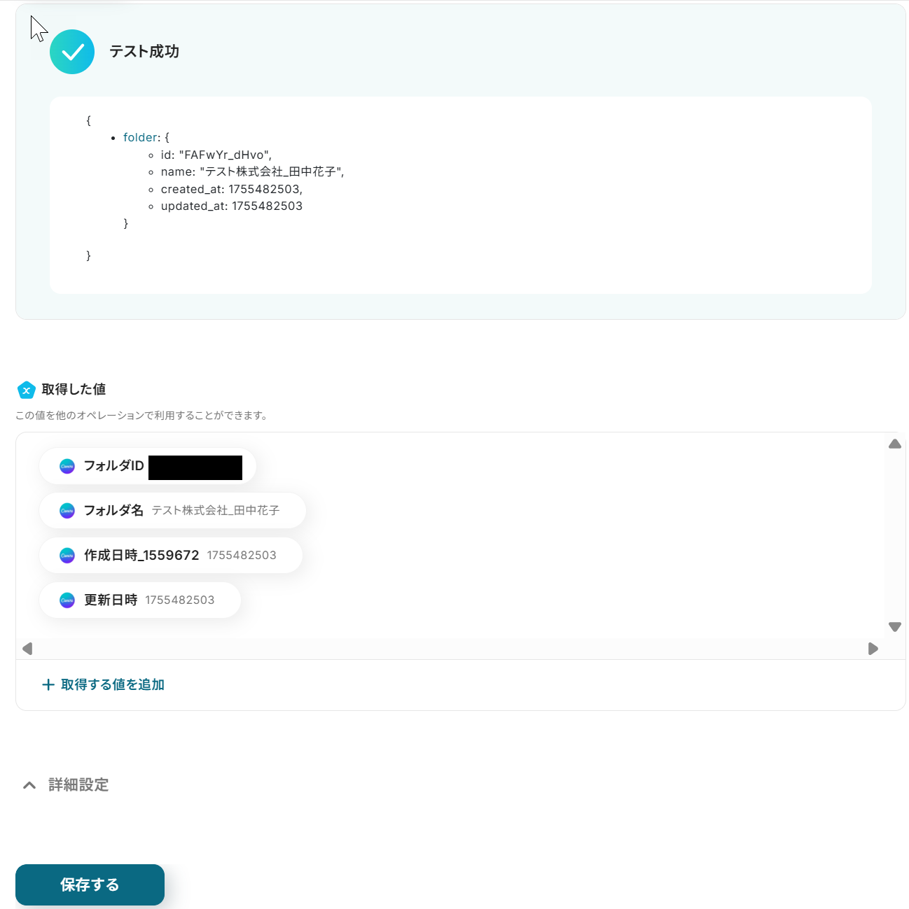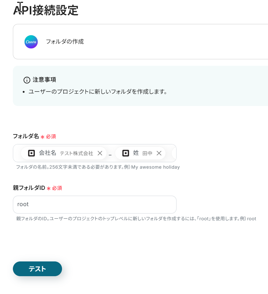 前項で取得した値から、Canvaにフォルダを作成する設定を行います。