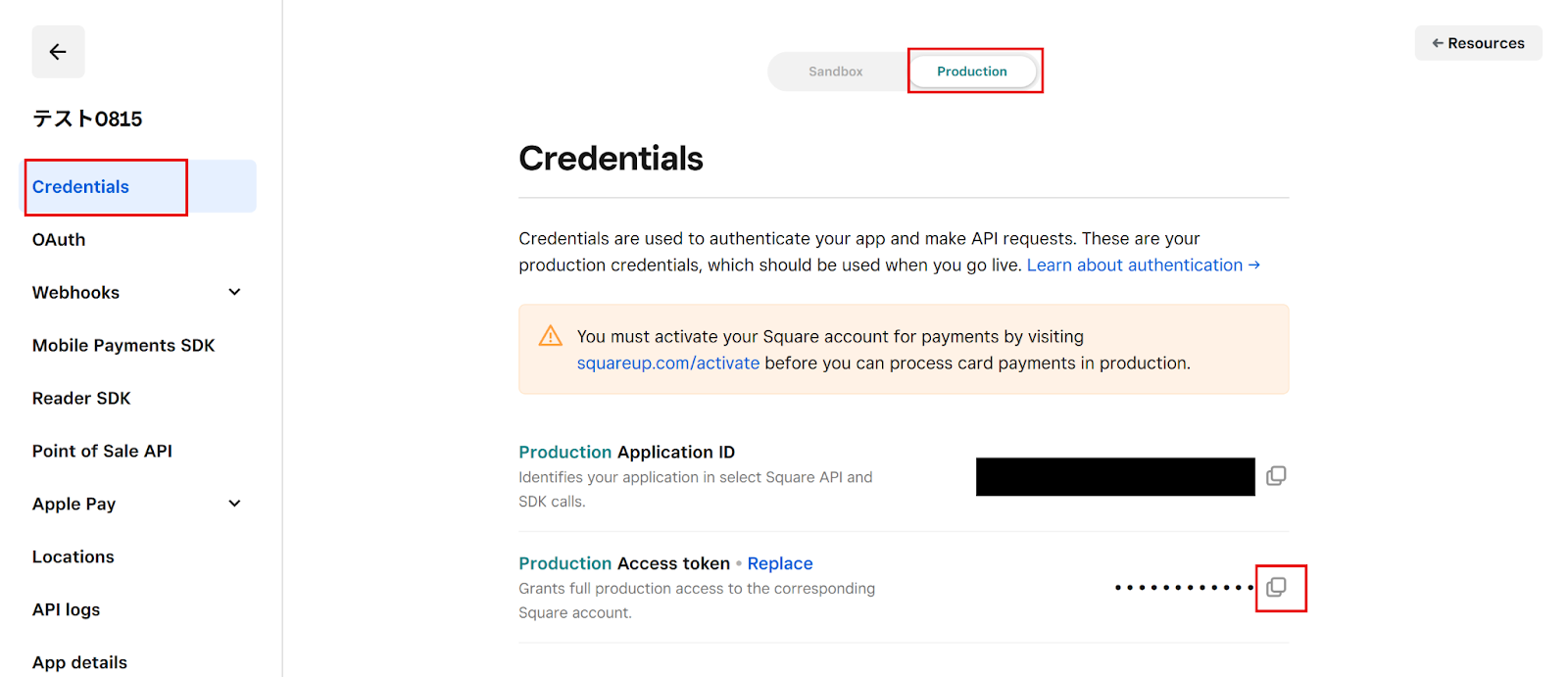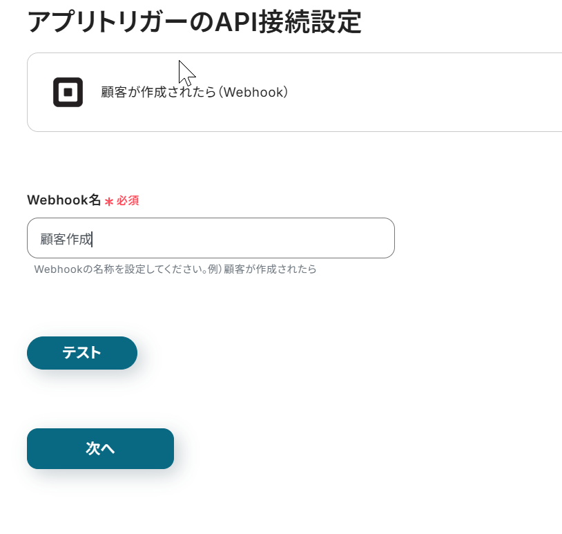 この画面では、Squareに移動して、Webhookイベント(顧客の作成)を実行します。