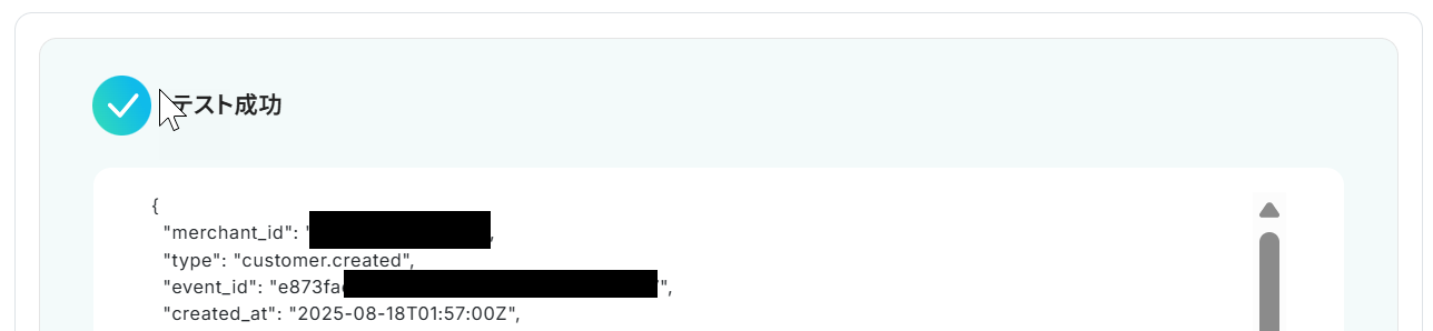 テストに成功すると以下のように表示され、取得した値(アウトプット)が出力されます。
