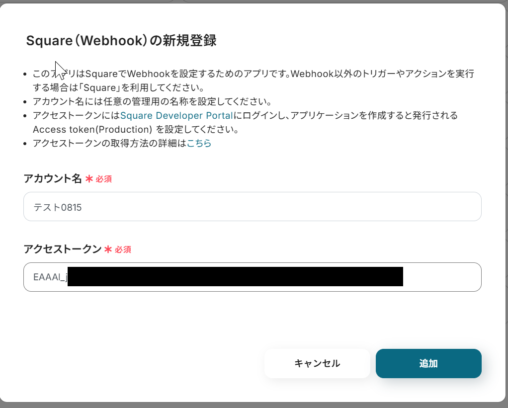 - Square(Webhook)と連携するアカウント情報:マイアプリ連携したアカウントが記載されています。