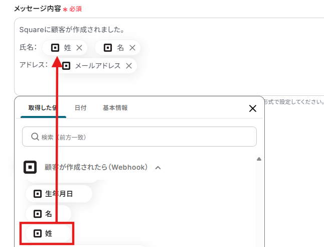 メッセージ内容には以下のようにSquareで取得した値から、氏名などを設定しました。
