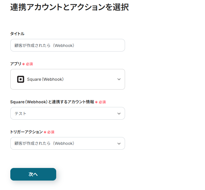 連携アカウントとアクションを選択する画面が表示されるので、今回連携するSquareのアカウントを確認し「次へ」をクリックします。