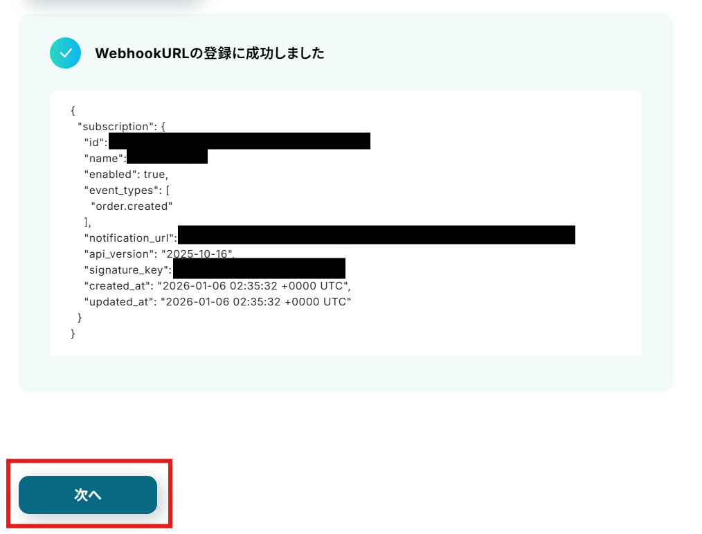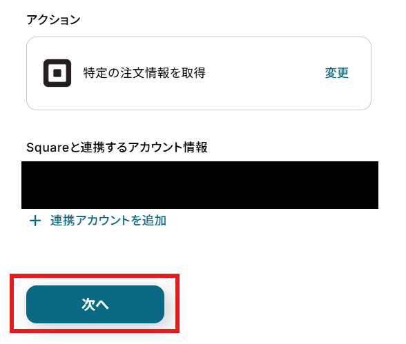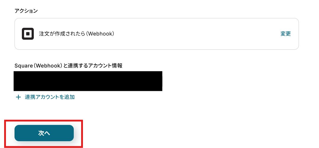 「Square(Webhook)と連携するアカウント情報」を確認し、「次へ」をクリックして進んでください。