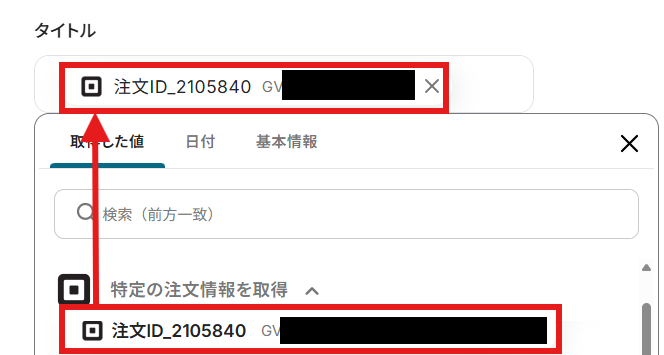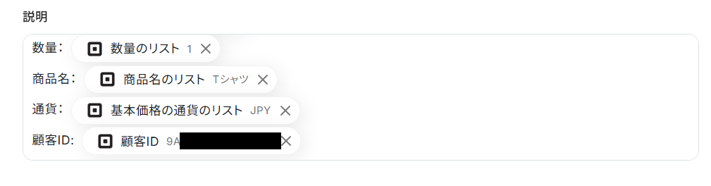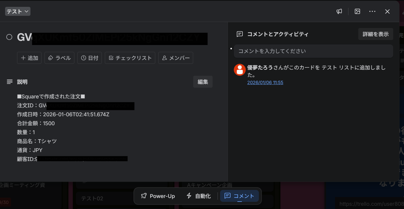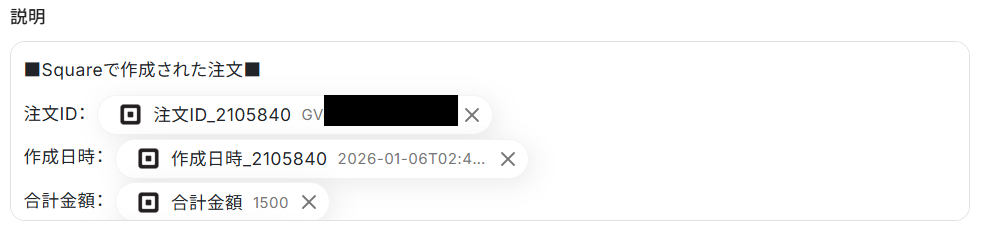 - カードのタイトルや説明欄には、前のステップでSquareから取得した注文情報(注文ID、商品名など)を動的に設定することが可能です