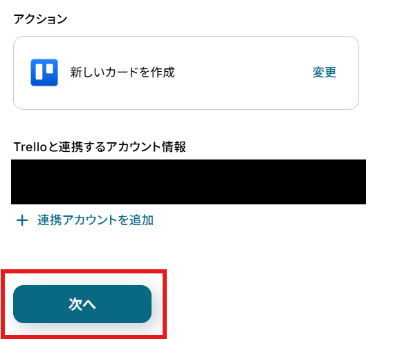「Trelloと連携するアカウント情報」を確認し、「次へ」をクリックして進んでください。
