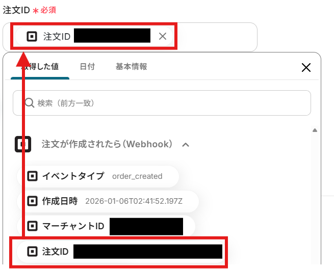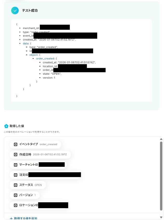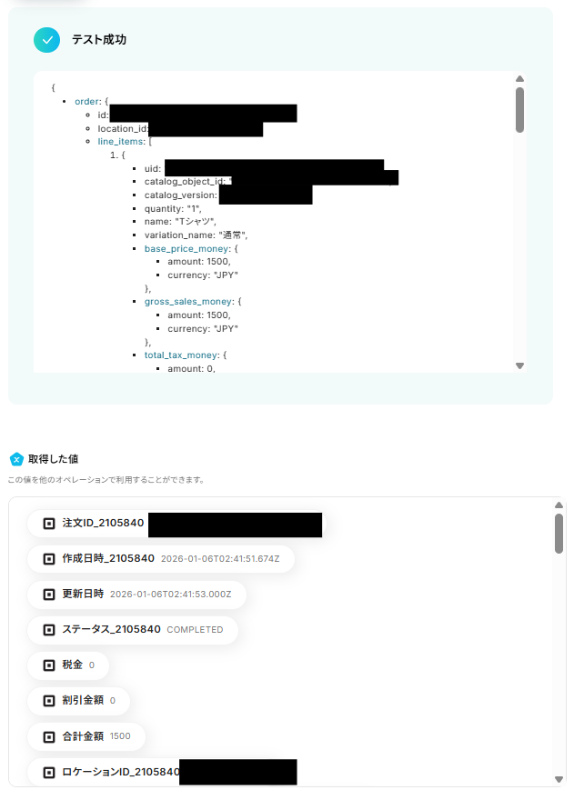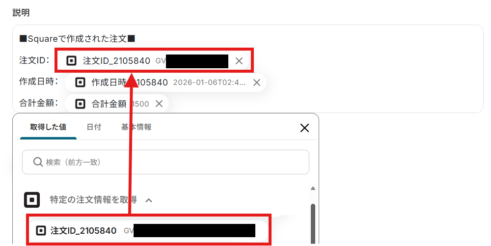 - 次に、オペレーションでSquareの「特定の注文情報を取得」アクションを設定し、トリガーで取得した注文IDを基に詳細情報を取得します