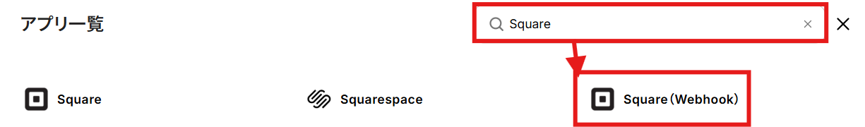 「新規接続」を選択すると「アプリ一覧」が表示されます。Square(Webhook)を検索して選択しましょう。