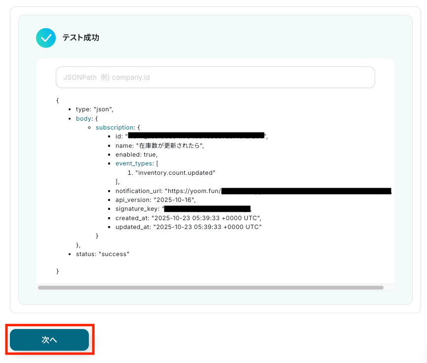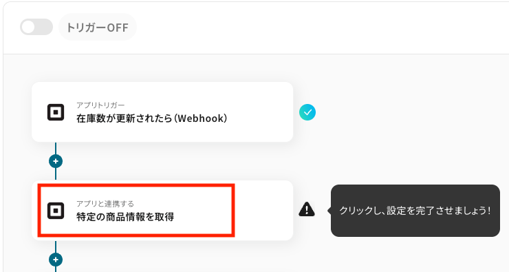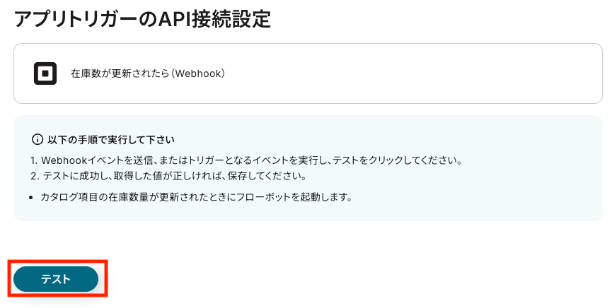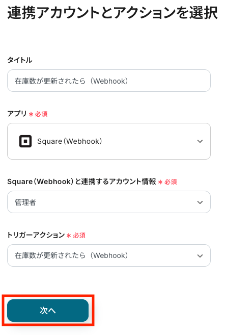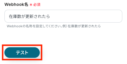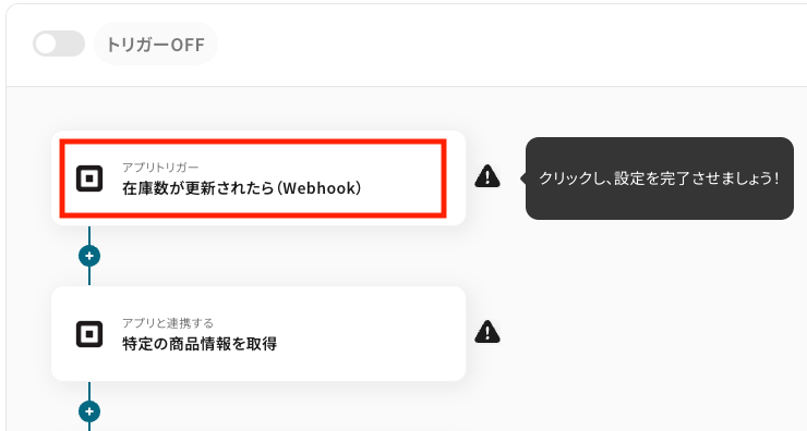 - トリガーアクション:テンプレート通りに「在庫数が更新されたら(Webhook)」を選択します。