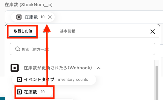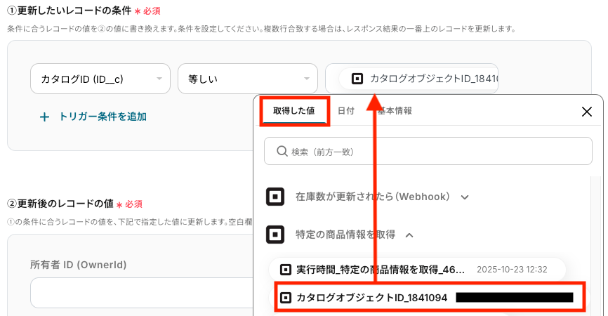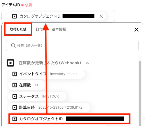 「在庫数が更新されたら(Webhook)」の中から、カタログオブジェクトIDを選びましょう。