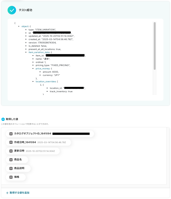 テストに成功すると、以下のように「取得した値」が表示されます。