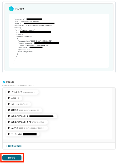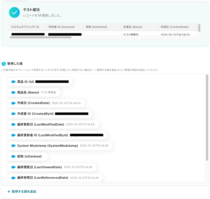 必要に応じて、「+取得する値を追加」ボタンから他のデータを取得することも可能です。