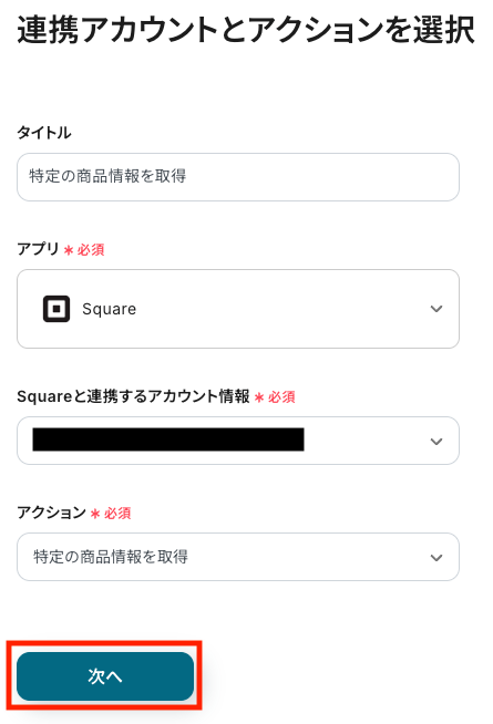 - アカウント情報:ステップ1で連携したアカウントが自動で選択されています。